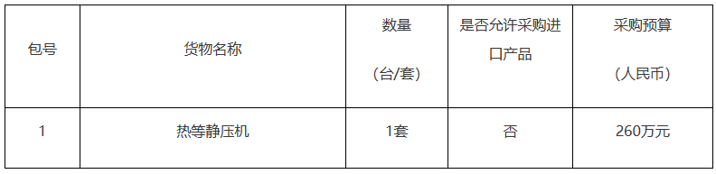 項(xiàng)目名稱:中國科學(xué)院上海應(yīng)用物理研究所熱等靜壓機(jī)采購項(xiàng)目