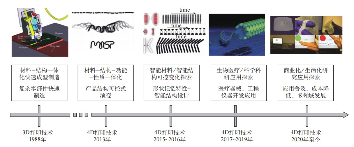 4D打印發(fā)展歷程及技術(shù)特點(來源:馮韜等,《4D打印智能材料及產(chǎn)品應(yīng)用研究進展》)