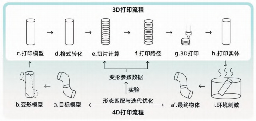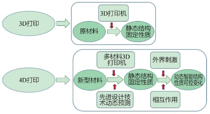 與3D打印相同,4D打印是一種集材料科學(xué)、機械科學(xué)以及計算機科學(xué)等諸多學(xué)科高度交叉融合的先進制造技術(shù)。但又與3D打印不同,4D打印是一種具備動態(tài)演變能力的智能制造技術(shù),是在3D打印基礎(chǔ)上結(jié)合智能材料與智能結(jié)構(gòu)設(shè)計,針對制造產(chǎn)品的形態(tài)、性能和功能方面的進一步發(fā)展。