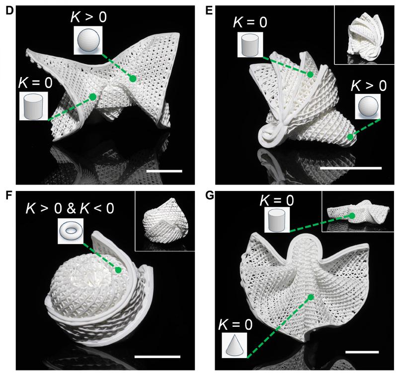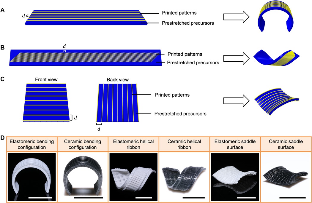 第二種方法是通過將陶瓷前驅(qū)體按照設(shè)計好的紋路打印在預(yù)拉伸的陶瓷前驅(qū)體上,在預(yù)應(yīng)力被釋放時,就會發(fā)生4D變形。通過設(shè)計在預(yù)拉伸表面打印的路徑可以控制應(yīng)力釋放后的4D變形。文中以幾個有代表性的拓撲結(jié)構(gòu)作為例子,展示了彎曲,螺旋和馬鞍面的打印過程。