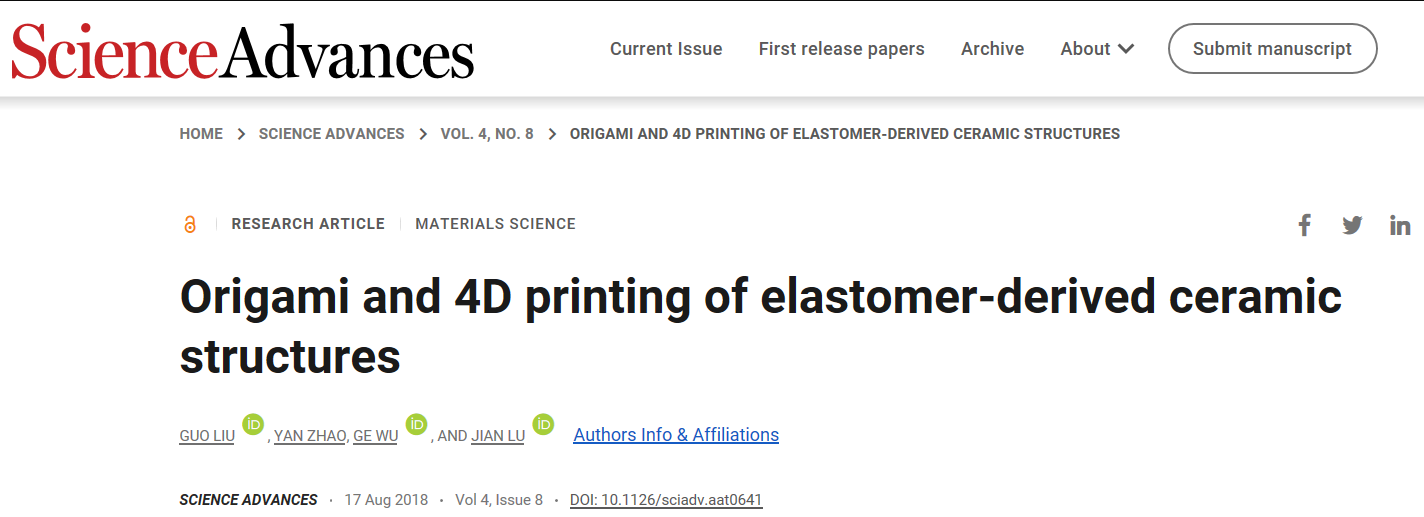 相關(guān)研究工作以“Origami and 4D printing of elastomer-derived ceramics”為題發(fā)表在《Science Advances》上。