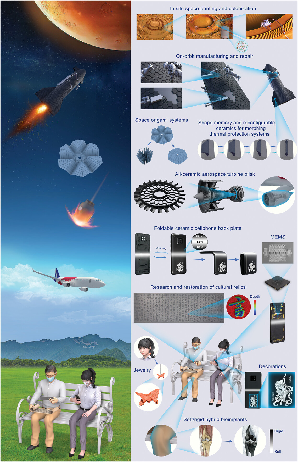 該工作首次實現(xiàn)了4D增減材復(fù)合制造陶瓷,亦首次實現(xiàn)了4D打印形狀記憶陶瓷。該工作提出的4D增減材復(fù)合制造形狀記憶陶瓷技術(shù)可實現(xiàn)高精度(十微米級),大尺寸(十厘米級),超快的前驅(qū)體轉(zhuǎn)變?yōu)樘沾傻乃俣龋◣酌腌妰?nèi)),以及前驅(qū)體材料的快速制造(批量生產(chǎn)能力),有力推動了陶瓷4D打印技術(shù)的潛在應(yīng)用發(fā)展,有望應(yīng)用于航空航天(全陶瓷整體渦輪葉盤、可變形熱防護系統(tǒng),太空折疊系統(tǒng),在軌制造和修復(fù),原位太空打印和殖民等)、3C電子(可折疊陶瓷手機背板、微機電系統(tǒng)等)、生物醫(yī)療(生物植入物等)、和藝術(shù)(文物研究和修復(fù)、首飾、裝飾品等)等領(lǐng)域。