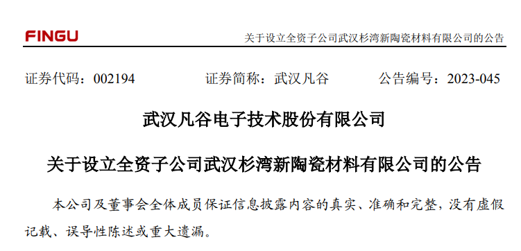 中國(guó)粉體網(wǎng)訊 10月11日,武漢凡谷發(fā)布公告,根據(jù)公司戰(zhàn)略發(fā)展和業(yè)務(wù)拓展的需要,公司以自有資金人民幣1.5億元投資設(shè)立全資子公司武漢杉灣新陶瓷材料有限公司(以下簡(jiǎn)稱(chēng)“杉灣新陶瓷”)。