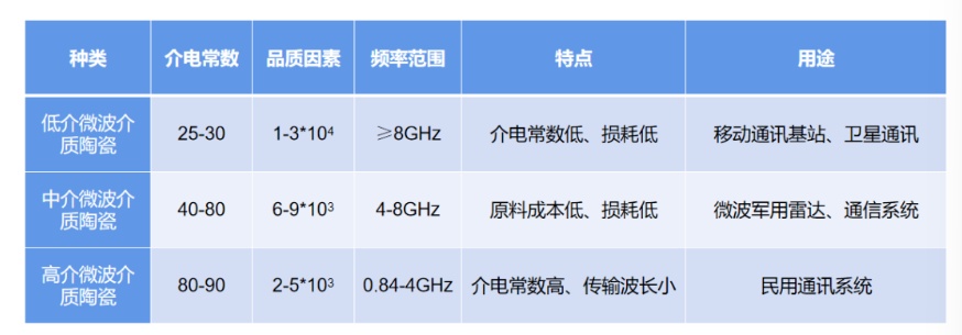 微波介質(zhì)陶瓷按照介電常數(shù)的大小,可將其分為低介電常數(shù)類、中介電常數(shù)類和高介電常數(shù)類。