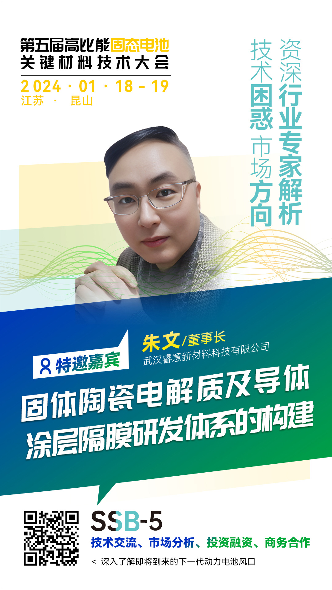 針對(duì)固態(tài)電池相關(guān)的技術(shù)、材料、市場及產(chǎn)業(yè)等方面的問題,中國粉體網(wǎng)將在昆山舉辦第五屆高比能固態(tài)電池關(guān)鍵材料技術(shù)大會(huì)。為致力于固態(tài)電池技術(shù)開發(fā)的企業(yè),科研院校,以及電動(dòng)車、儲(chǔ)能、特種應(yīng)用等終端企業(yè)提供信息交流的平臺(tái),開展產(chǎn)、學(xué)、研合作,共同推動(dòng)行業(yè)發(fā)展。屆時(shí),武漢睿意新材料科技有限公司董事長、華中科技大學(xué)材料科學(xué)與工程學(xué)院教授朱文將作題為《固體陶瓷電解質(zhì)及導(dǎo)體涂層隔膜研發(fā)體系的構(gòu)建》的報(bào)告。報(bào)告主講人將對(duì)其公司固體陶瓷電解質(zhì)及導(dǎo)體涂層隔膜研發(fā)體系的構(gòu)建展開介紹。