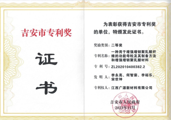 中國(guó)粉體網(wǎng)訊 近日,從吉安市委市政府、吉安市場(chǎng)監(jiān)督管理局傳來(lái)好消息,廣源集團(tuán)發(fā)明專利“一種用于增強(qiáng)增韌聚乳酸纖維的功能母粒及其制備方法和增強(qiáng)增韌聚乳酸材料”榮獲“2023年度吉安市專利二等獎(jiǎng)”;發(fā)明專利“一種乳膠手套專用超細(xì)重質(zhì)碳酸鈣及其制備方法與應(yīng)用”榮獲“2023年度吉安市專利三等獎(jiǎng)”。