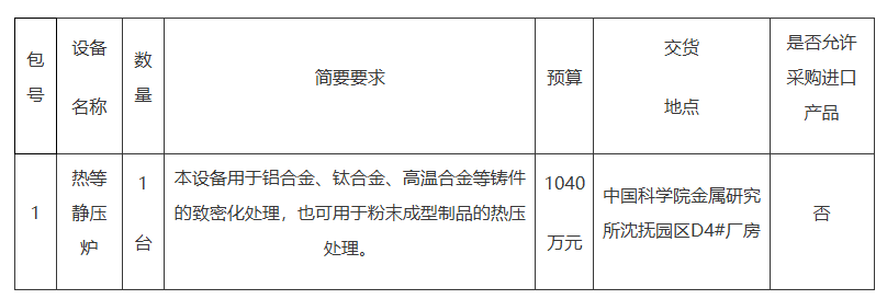 項(xiàng)目名稱:中國科學(xué)院金屬研究所熱等靜壓爐采購項(xiàng)目