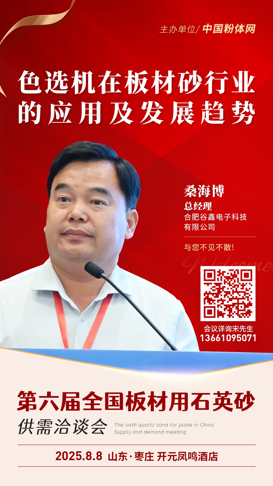 隨著人造石英石板材市場的蓬勃發(fā)展,石英砂作為核心原材料的品質(zhì)把控愈發(fā)關鍵,色選機在提升石英砂純度、保障板材質(zhì)量等方面的作用日益凸顯。2025年8月8日,由中國粉體網(wǎng)主辦的第六屆全國板材用石英砂供需洽談會即將在山東棗莊召開,合肥谷鑫電子科技有限公司總經(jīng)理桑海博將做《色選機在板材砂行業(yè)的應用及發(fā)展趨勢》的報告,屆時,他將對色選機在板材砂行業(yè)的應用及發(fā)展趨勢等問題進行詳細解讀。
