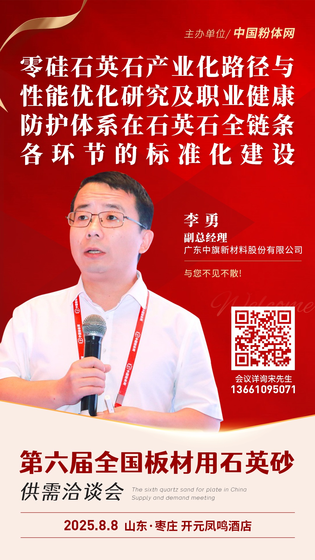 2025年8月8日,由中國(guó)粉體網(wǎng)主辦的第六屆全國(guó)板材用石英砂供需洽談會(huì)將在山東棗莊召開,廣東中旗新材料股份有限公司副總經(jīng)理李勇將做《零硅石英石產(chǎn)業(yè)化路徑與性能優(yōu)化研究及職業(yè)健康防護(hù)體系在石英石全鏈條各環(huán)節(jié)的標(biāo)準(zhǔn)化建設(shè)》的報(bào)告,屆時(shí),他將深度闡釋人造石英石帶來的健康與安全風(fēng)險(xiǎn),分享零硅石英石的產(chǎn)業(yè)化方法。