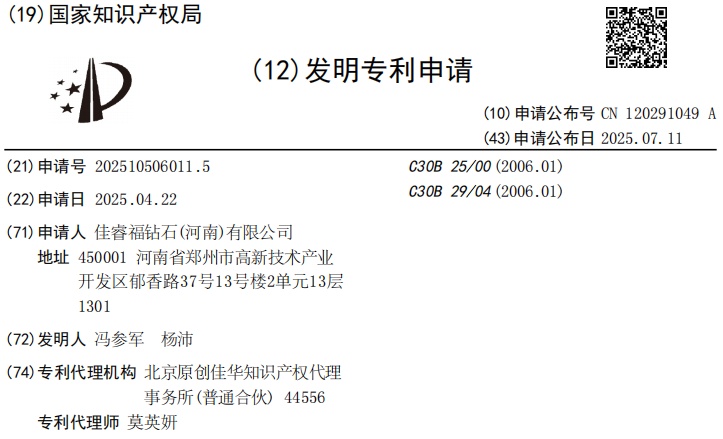 中國(guó)粉體網(wǎng)訊 近日,國(guó)家知識(shí)產(chǎn)權(quán)局信息顯示,佳睿福鉆石(河南)有限公司申請(qǐng)一項(xiàng)名為“一種彩色大顆粒金剛石制備裝置及制備工藝”的專利,公開號(hào)CN120291049A,申請(qǐng)日期為2025年04月。