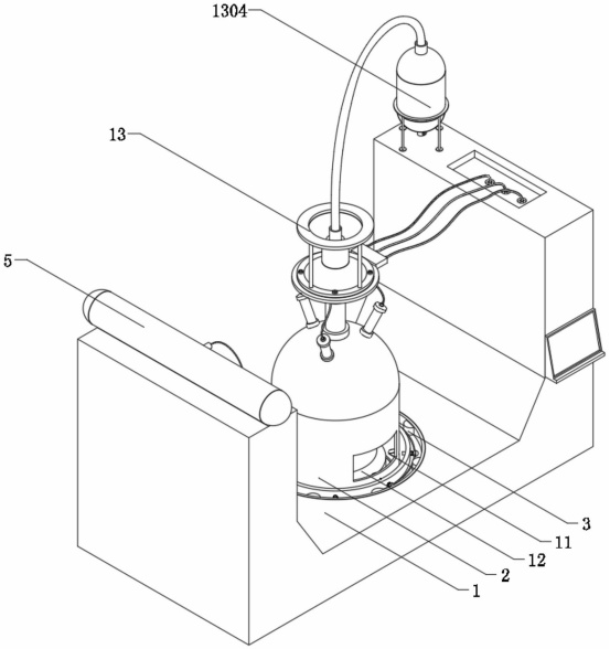 本發(fā)明涉及金剛石制備的技術(shù)領(lǐng)域,公開了一種彩色大顆粒金剛石制備裝置及制備工藝,包括工作臺(tái)、生長(zhǎng)艙罩,工作臺(tái)的頂部安裝有吹氣組件、控壓機(jī)構(gòu),工作臺(tái)內(nèi)壁位于第一環(huán)形卡槽的下方開設(shè)有第二環(huán)形卡槽,第一環(huán)形卡槽的內(nèi)壁轉(zhuǎn)動(dòng)連接有環(huán)形盤,環(huán)形盤內(nèi)壁的邊側(cè)等距離固定設(shè)有多個(gè)凸塊,環(huán)形盤的底部固定設(shè)有連接環(huán),連接環(huán)的底部穿過(guò)第二環(huán)形卡槽的內(nèi)壁連接有齒環(huán),第二環(huán)形卡槽內(nèi)壁的一端轉(zhuǎn)動(dòng)連接有齒輪。