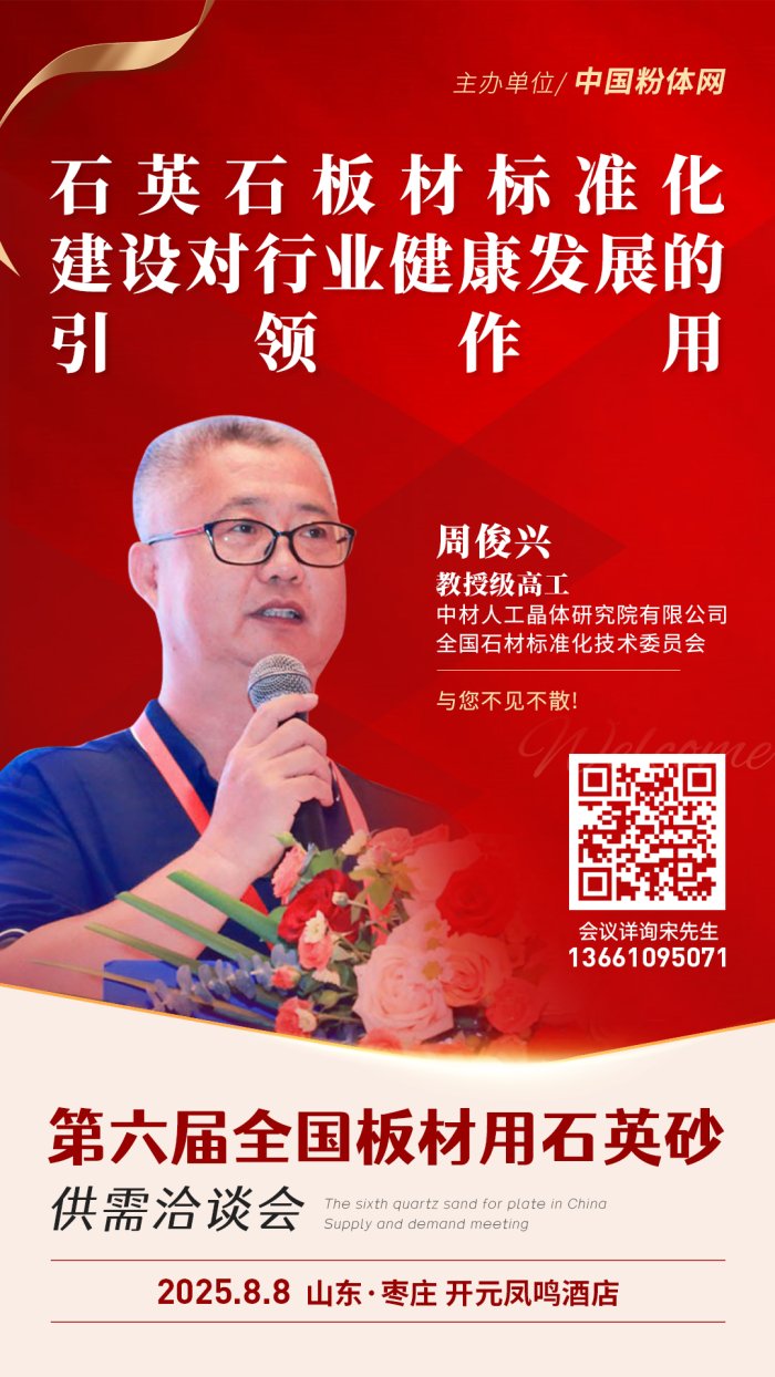 2025年8月8日,由中國粉體網(wǎng)主辦的第六屆全國板材用石英砂供需洽談會即將在山東棗莊召開,全國石材標準化技術(shù)委員會周俊興秘書長將做《石英石板材標準化建設(shè)對行業(yè)健康發(fā)展的引領(lǐng)作用》的報告,屆時,他將對石英石板材標準化建設(shè)對行業(yè)健康發(fā)展的引領(lǐng)作用等問題進行詳細解讀。