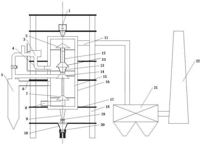 這是“一種高效環(huán)保的塔式混燃輕燒鎂豎窯及其生產(chǎn)工藝”,在豎窯爐體內外分別設置內燃燒室和外燃燒室,從內外燃燒室產(chǎn)生的高溫煙氣同時從豎窯爐體中心區(qū)域和周邊區(qū)域與下落的物料進行熱量交換,提高能量利用效率,降低非金屬礦物輕燒產(chǎn)生的環(huán)保問題,同時采用塔式結構易于平衡受力,提高爐窯壽命。