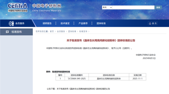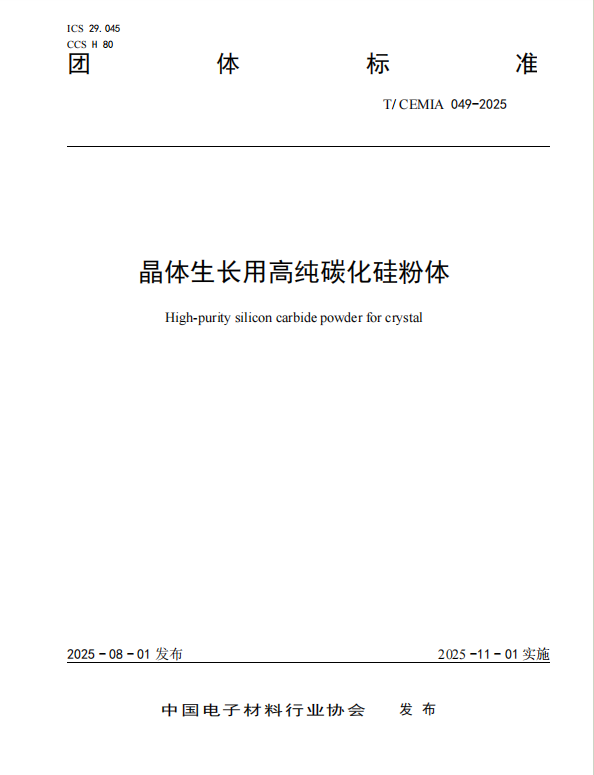 中國粉體網訊 2025年8月1日,中國電子材料行業(yè)協(xié)會官網發(fā)函,批準發(fā)布團體標準《晶體生長用高純碳化硅粉體》,并予以公示,團體標準編號為“T/CEMIA 049-2025”,實施日期是2025年11月1日。