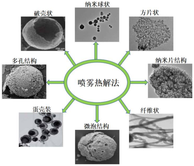 噴霧熱解已被證明是一種簡(jiǎn)便的制備復(fù)合材料和各種納米粉體材料的有效方法,通過設(shè)計(jì)前驅(qū)溶液組成,調(diào)控工藝參數(shù),可以制備出中空結(jié)構(gòu)、致密球體、蛋黃殼結(jié)構(gòu)、核殼結(jié)構(gòu)、納米板、納米棒、納米薄膜等各種納米材料。