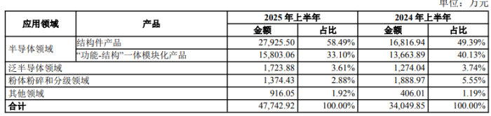 半導體領(lǐng)域是公司產(chǎn)品的主要應用方向,公司在2025年上半年及2024年同期來自半導體設備領(lǐng)域的先進陶瓷材料零部件收入分別為43,728.56萬元和30,480.83萬元,占先進陶瓷材料零部件收入的比例分別為91.59%和89.52%。