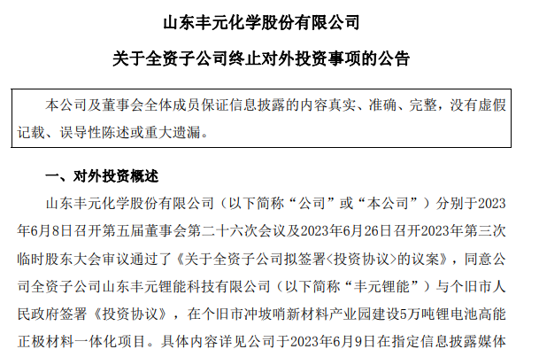 中國(guó)粉體網(wǎng)訊 8月30日,山東豐元化學(xué)股份有限公司發(fā)布公告,宣布全資子公司山東豐元鋰能科技有限公司將終止在個(gè)舊市的對(duì)外投資事項(xiàng)。