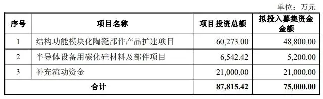 珂瑪科技發(fā)布公告稱,公司擬向不特定對(duì)象發(fā)行可轉(zhuǎn)換公司債券,擬募集資金總額不超過(guò)7.5億元,將全部投資于以下項(xiàng)目:結(jié)構(gòu)功能模塊化陶瓷部件產(chǎn)品擴(kuò)建項(xiàng)目、半導(dǎo)體設(shè)備用碳化硅材料及部件項(xiàng)目及補(bǔ)充流動(dòng)資金。