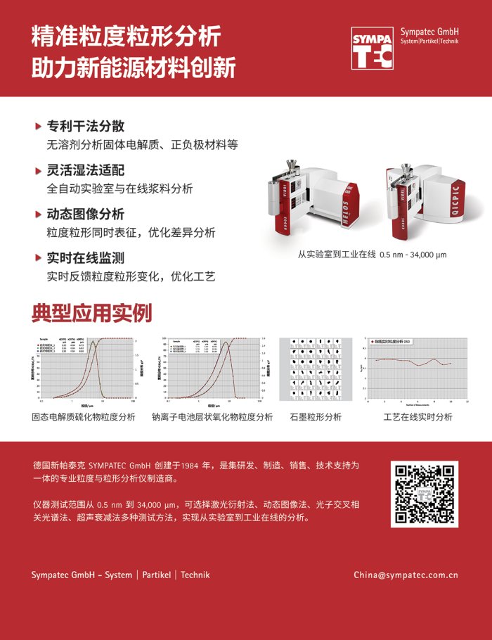德國新帕泰克干法激光粒度儀,憑借其技術(shù)專業(yè)、性能穩(wěn)定和操作簡便的優(yōu)勢,成為固態(tài)電池材料測試的理想選擇。此外,從原礦材料到電池制造與回收,德國新帕泰克從0.5 nm到33,792 μm為電池材料的粒度與粒形表征提供各種定制化的解決方案。