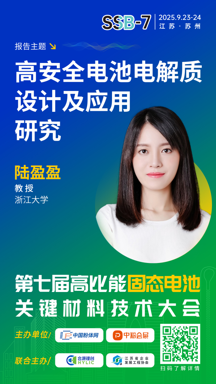 針對固態(tài)電池產(chǎn)業(yè)化發(fā)展現(xiàn)狀,中國粉體網(wǎng)聯(lián)合合源鋰創(chuàng)、江蘇省企業(yè)發(fā)展工程協(xié)會將于2025年9月23-24日在江蘇· 蘇州舉辦第七屆高比能固態(tài)電池關(guān)鍵材料技術(shù)大會。為致力于固態(tài)電池技術(shù)開發(fā)的企業(yè),科研院校,以及新能源汽車、儲能、消費電子等終端企業(yè)提供信息交流的平臺,開展產(chǎn)、學、研合作。屆時,來自浙江大學的陸盈盈教授將作題為《高安全電池電解質(zhì)設計及應用研究》的報告。