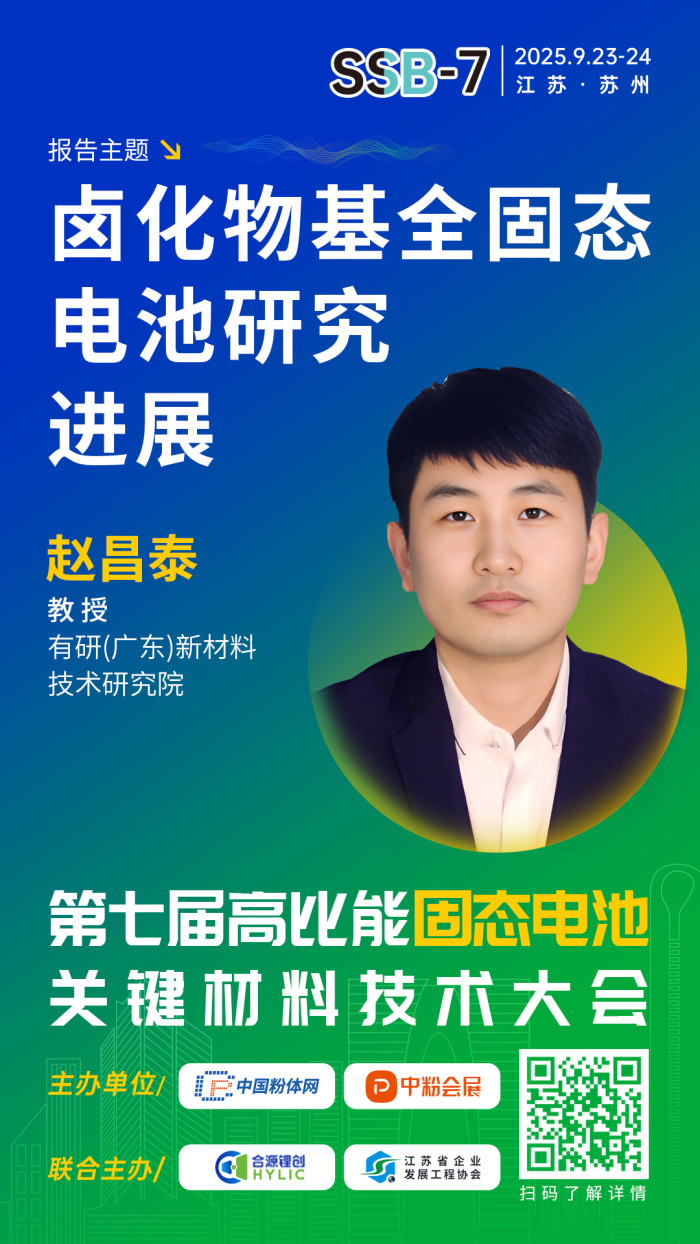 針對(duì)固態(tài)電池產(chǎn)業(yè)化發(fā)展現(xiàn)狀,中國(guó)粉體網(wǎng)聯(lián)合合源鋰創(chuàng)、江蘇省企業(yè)發(fā)展工程協(xié)會(huì)將于2025年9月23-24日在江蘇· 蘇州舉辦第七屆高比能固態(tài)電池關(guān)鍵材料技術(shù)大會(huì)。為致力于固態(tài)電池技術(shù)開發(fā)的企業(yè),科研院校,以及新能源汽車、儲(chǔ)能、消費(fèi)電子等終端企業(yè)提供信息交流的平臺(tái),開展產(chǎn)、學(xué)、研合作。屆時(shí),來(lái)自有研(廣東)新材料技術(shù)研究院的趙昌泰教授將作題為《鹵化物基全固態(tài)電池研究進(jìn)展》的報(bào)告。