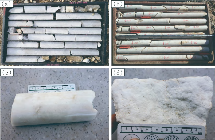該脈石英礦石特征 a—礦石劈切后巖心;b—礦石巖心;c—礦石巖心標本;d—礦石地表標本