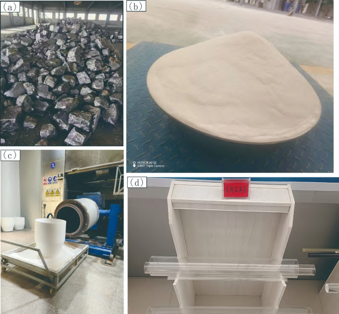 該脈石英礦產(chǎn)品照片 a—工業(yè)硅;b—高純石英砂;c—石英干鍋;d—高純石英管