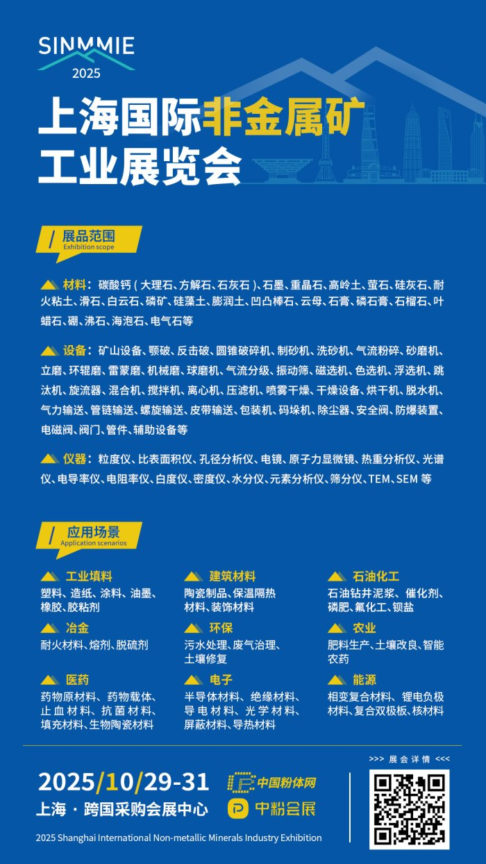 上海國(guó)際非金屬礦工業(yè)展覽會(huì)(SINMMIE2025)將于2025年10月29-31日在上?鐕(guó)采購(gòu)會(huì)展中心舉辦,華通粉體邀請(qǐng)您共同出席。