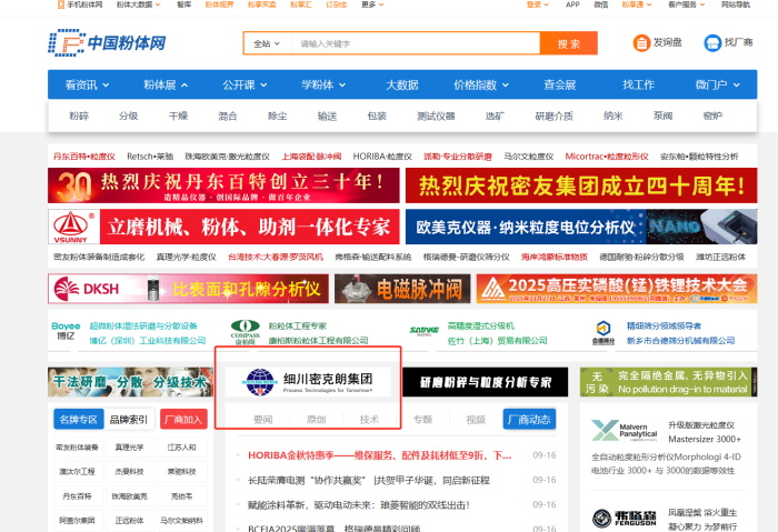 •行業(yè)場景化引流:在場景化引流層面,粉享通為細(xì)川密克朗量身定制專屬展示資源 —— 依托中國粉體網(wǎng)首頁核心廣告位,搭建動態(tài)輪播廣告矩陣。不同于常規(guī)曝光,該廣告聚焦細(xì)川密克朗設(shè)備在粉碎/分級、干燥/混合等細(xì)分領(lǐng)域的應(yīng)用優(yōu)勢,通過 “場景痛點(diǎn) + 設(shè)備解決方案” 的深度解讀,精準(zhǔn)匹配產(chǎn)業(yè)鏈上下游高需求客戶。這種 “需求 - 供給” 的定向觸達(dá)模式成效顯著,成為其高價值線索的核心來源之一。