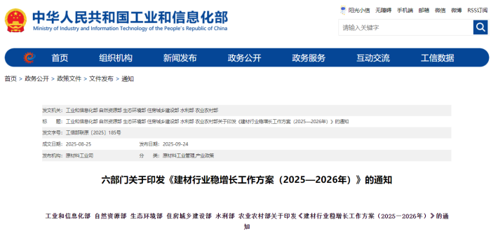 中國粉體網(wǎng)訊 9月24日,工信部等六部門發(fā)布關(guān)于印發(fā)《建材行業(yè)穩(wěn)增長工作方案(2025—2026年)》的通知。