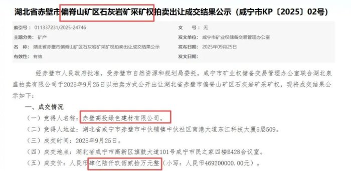 赤壁高投4.69億元拿下超3.25億噸石灰?guī)r