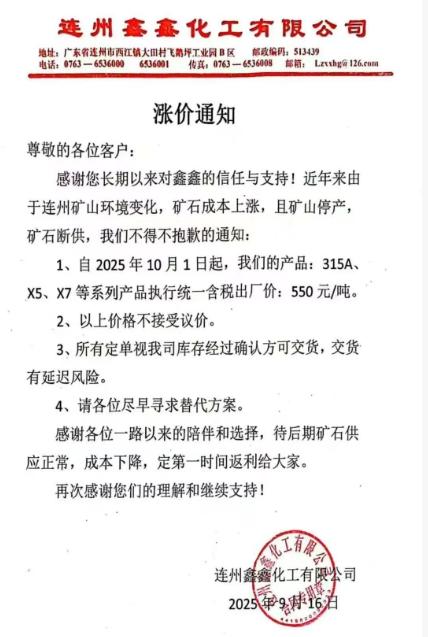 近日,碳酸鈣粉體生產(chǎn)企業(yè)連州鑫鑫化工有限公司發(fā)布漲價通知,宣布自2025年10月1日起,公司產(chǎn)品:315A、X5、X7等系列產(chǎn)品執(zhí)行統(tǒng)一含稅出廠價:550元/噸。造成漲價的原因是:連州礦山環(huán)境變化,礦石成本上漲,且礦山停產(chǎn),礦石斷供。