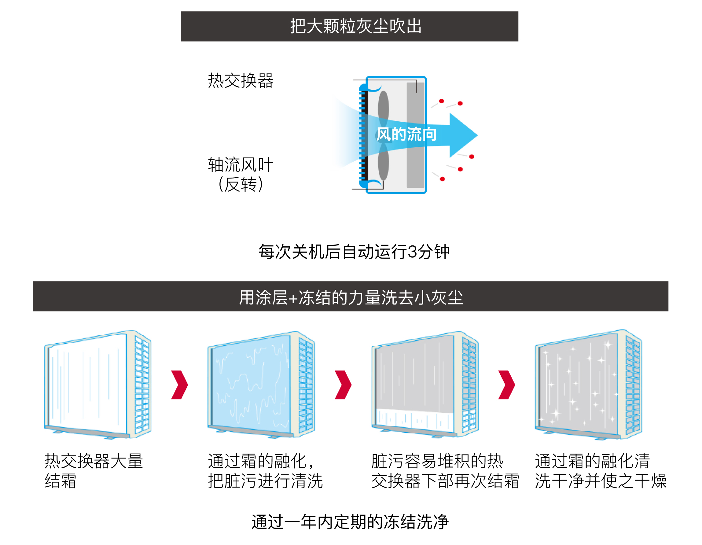 在常年的使用中,灰塵和污垢會積累在散熱器上,污垢積累到一定程度后,會影響外機的散熱使用。通過日立凍結洗凈技術,快速凍結設備內的潮濕空氣,利用溶解后的水流完成清洗,幫助有效去除室外機熱交換器中的灰塵和污垢。