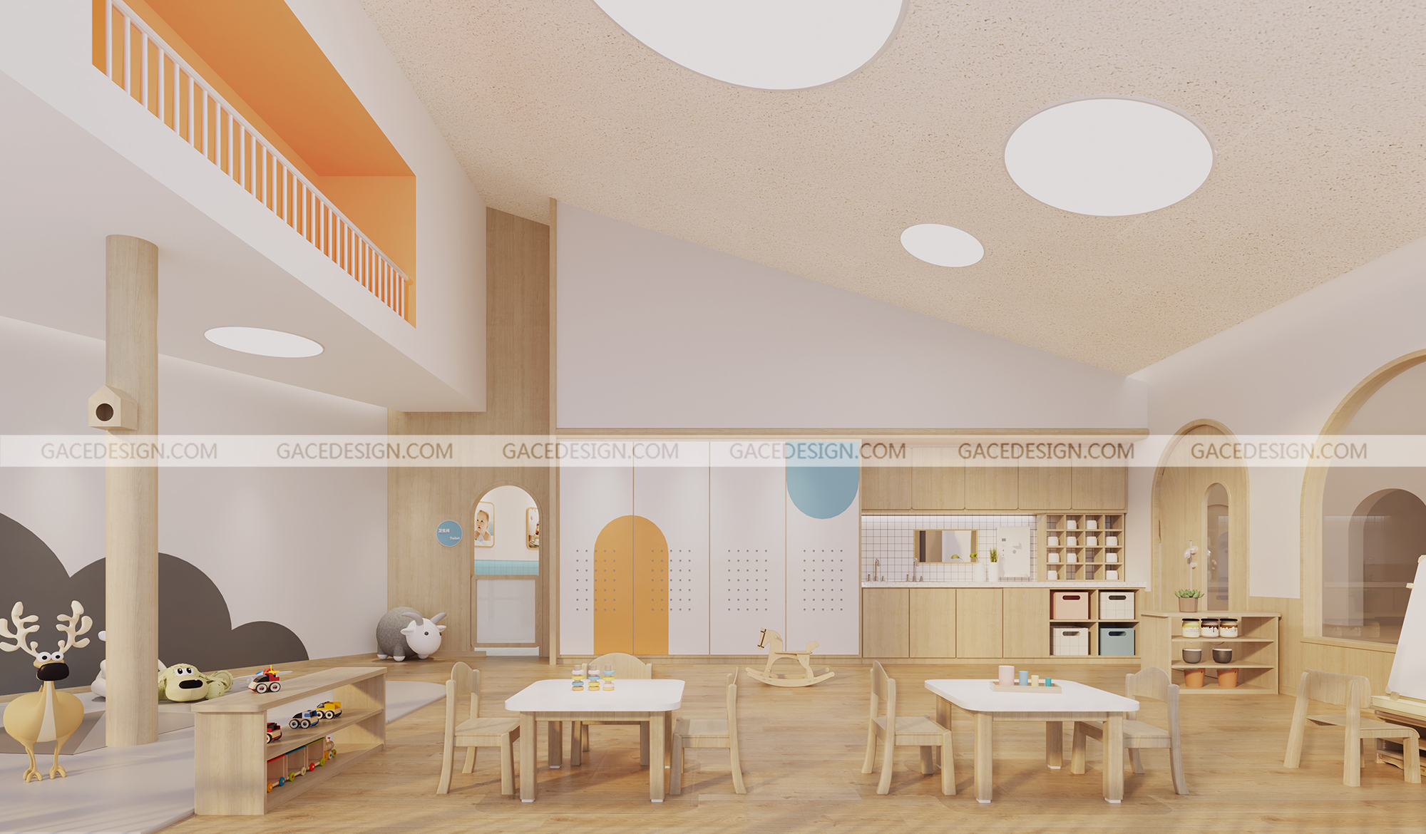 設(shè)計概括:作為浙江省臺州&嘉興市的第一批示范性且根據(jù)托育設(shè)置標(biāo)準(zhǔn)建設(shè)的盈利性高端托育園,總面積700&1000平。我們把設(shè)計重點放在了教育理念和兒童心理層面上。空間中除了功能性,以滿足孩子們的日常食宿,需要更多的可拓展性。場地為純粹的室內(nèi)空間,而幼兒天性的釋放往往在戶外。如何將戶外元素與功能性結(jié)合,我們想到用建筑思維來解構(gòu)空間,讓空間立體而生動。結(jié)合陳鶴琴老先生的教育理念,我們在室內(nèi)設(shè)計了富有親和力、天然感的兒童探索洞穴和一條無邊界的跑道。