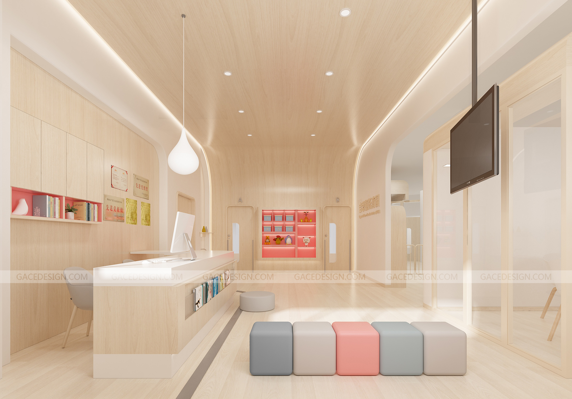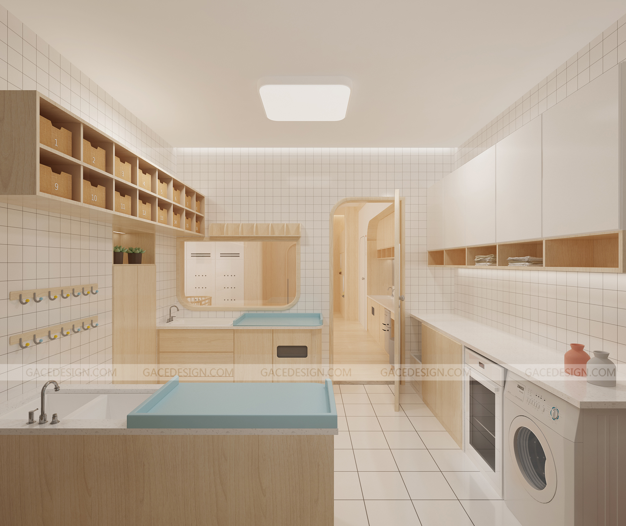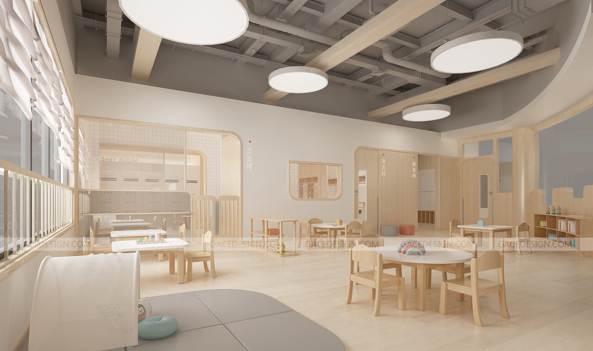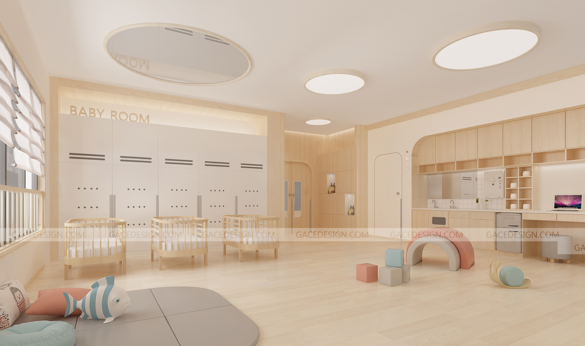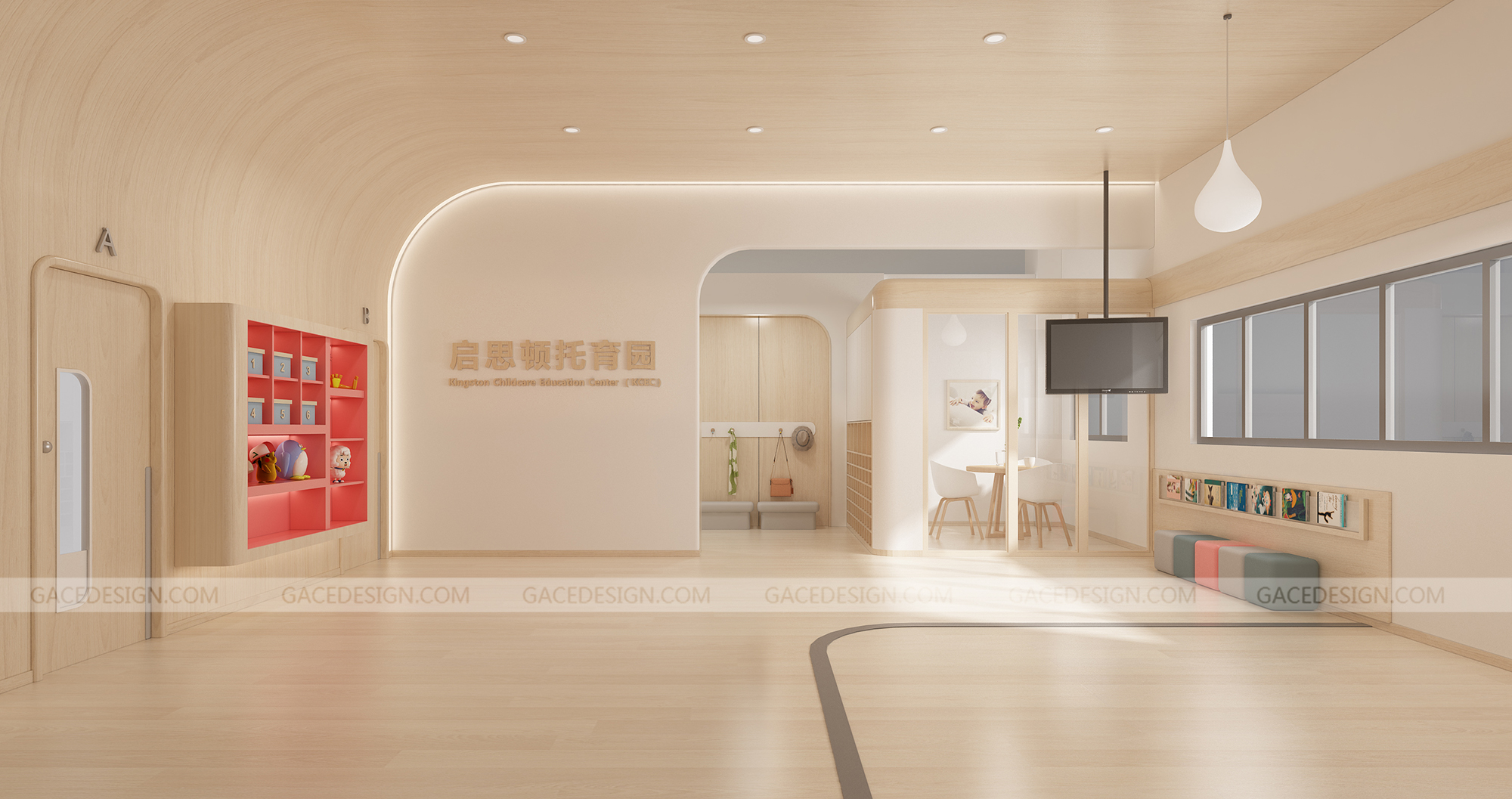 設(shè)計概括:這是我們幫啟思頓托育園設(shè)計的旗艦店,面積達到1000平以上,作為中山市高標(biāo)準(zhǔn)的示范性托育園,我們在設(shè)計之前組織設(shè)計師進行跟崗觀察,學(xué)習(xí)守護型嬰幼兒保育等系列保育書。考慮到保育員在操作層面上的便捷性,我們進行了場景模擬,把操作層面所涉及的柜體以及路徑進行了系統(tǒng)性整理。考慮到嬰幼兒在保育園的心理狀態(tài)以及發(fā)展心理學(xué)和空間敏感,我們定位這個項目是孩子的第二個家。是一家值得爸爸媽媽愿意托付的托育園。