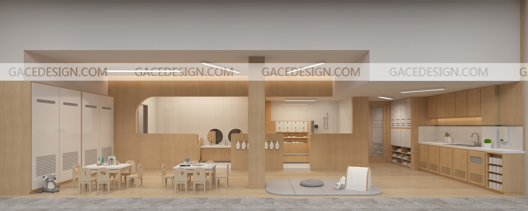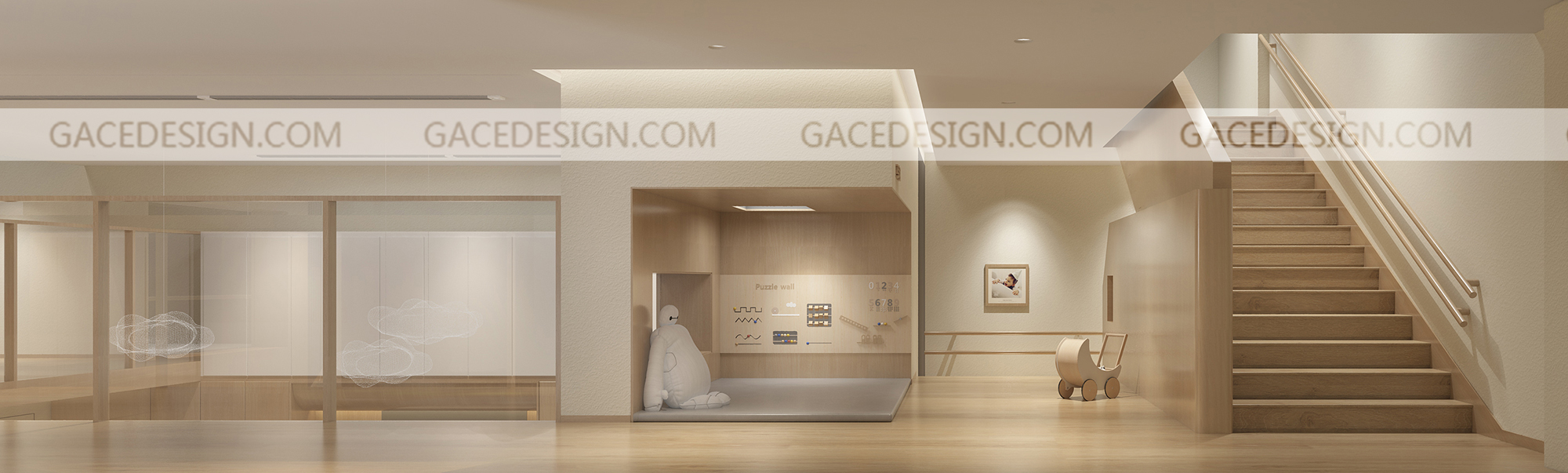 從前廳入口,我們設置了一個門廳,孩子就像回家一樣,在門廳處就完成了換鞋和洗手的功能,孩子有專屬的換鞋凳和鞋柜。空間造型上我們進行了簡化,保留了原有的層高,讓陽光最大程度的映入空間。在前臺處我們還設置了孩子尺度可觀賞的魚缸。在空間基調上我們選擇了柔和木質材料與自然光線的映射,使空間呈現明快輕松的氛圍。為了讓孩子自己與環境互動,我們在一層設置了一個空曠的空間,孩子們能夠在這里安全的爬行和玩耍,我們根據不同年齡段孩子的需求還設置了不同的區角,益智區、繪本角、涂鴉墻和感統區等等。在樓梯閣樓中我們加入了更多可互動性的功能。通過墻上的樂高墻壁,區域角的閱讀小書屋,攀爬區,滑梯,涂鴉墻。除此之外教室設計應充分的考慮孩子們的尺度和保育員的保育便捷和操作性。我們在項目中嘗試探討空間與兒童的探索關系。努力營造一種孩子可以自己發育成長的環境模式。