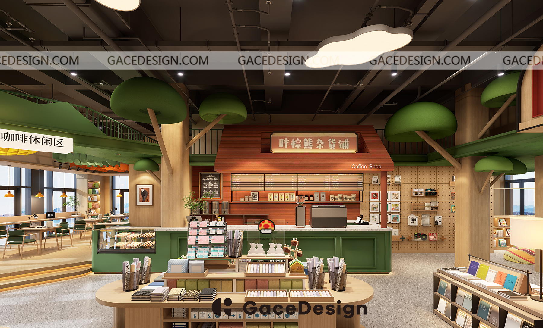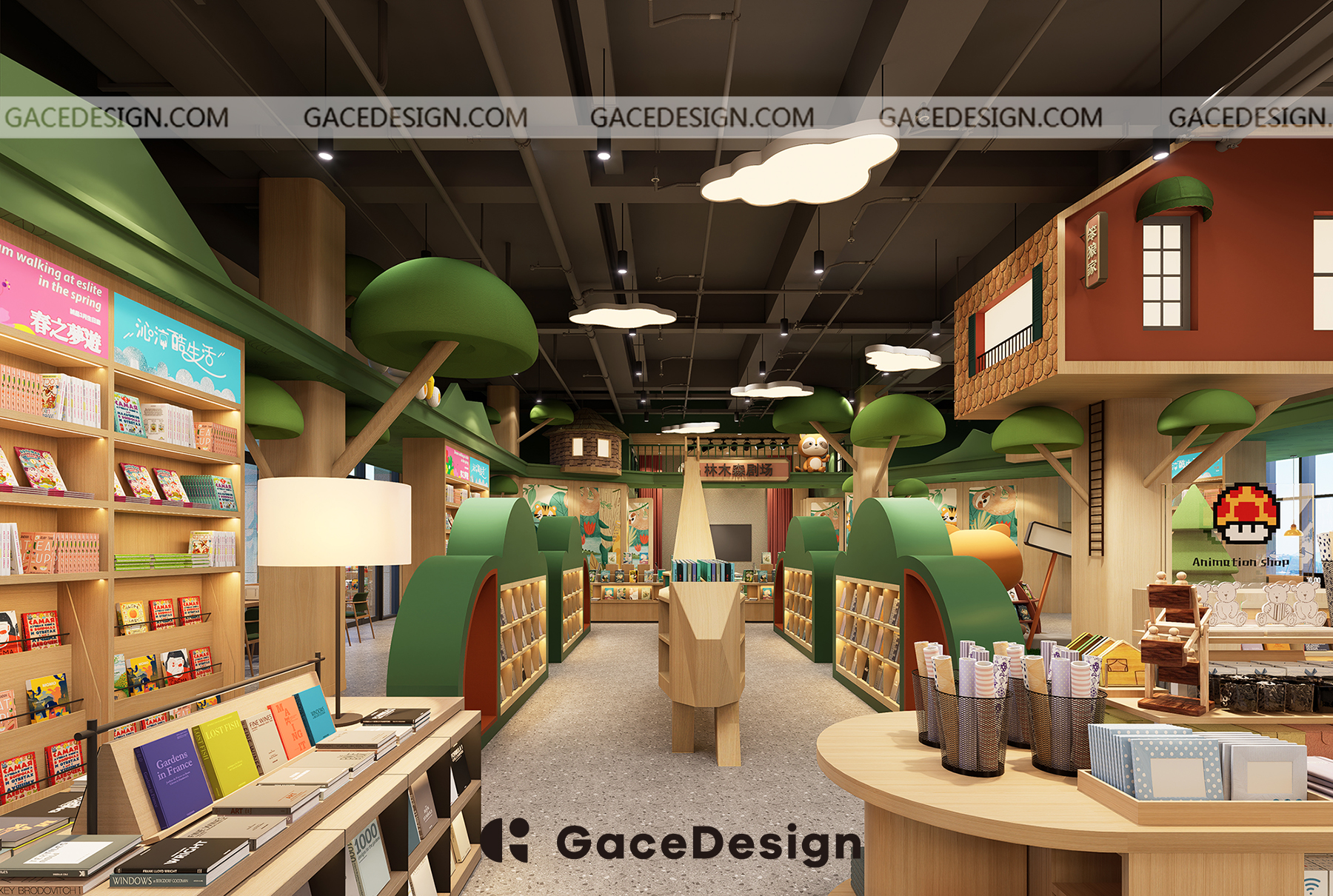 ?設計師希望給孩子更多類似森林的行走路徑,通過環境引發孩子自主尋找書的樂趣。以“室內建筑”為設計理念,鋪設綠色草坪,在室內開辟一處獨特的“森林仙蹤”場地,設計手法突出項目層高的優勢。功能區猶如散落在森林的獨棟小屋,樓上樓下,院內院外,皆是孩子的專屬天地。