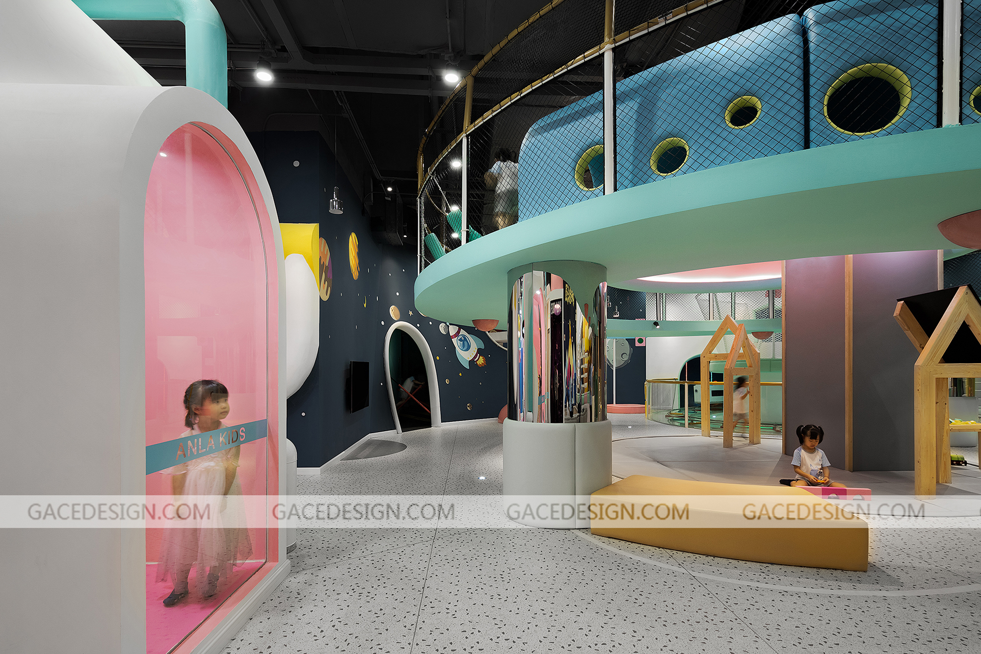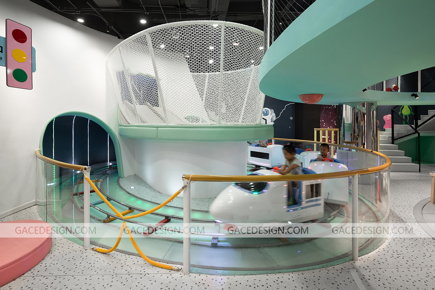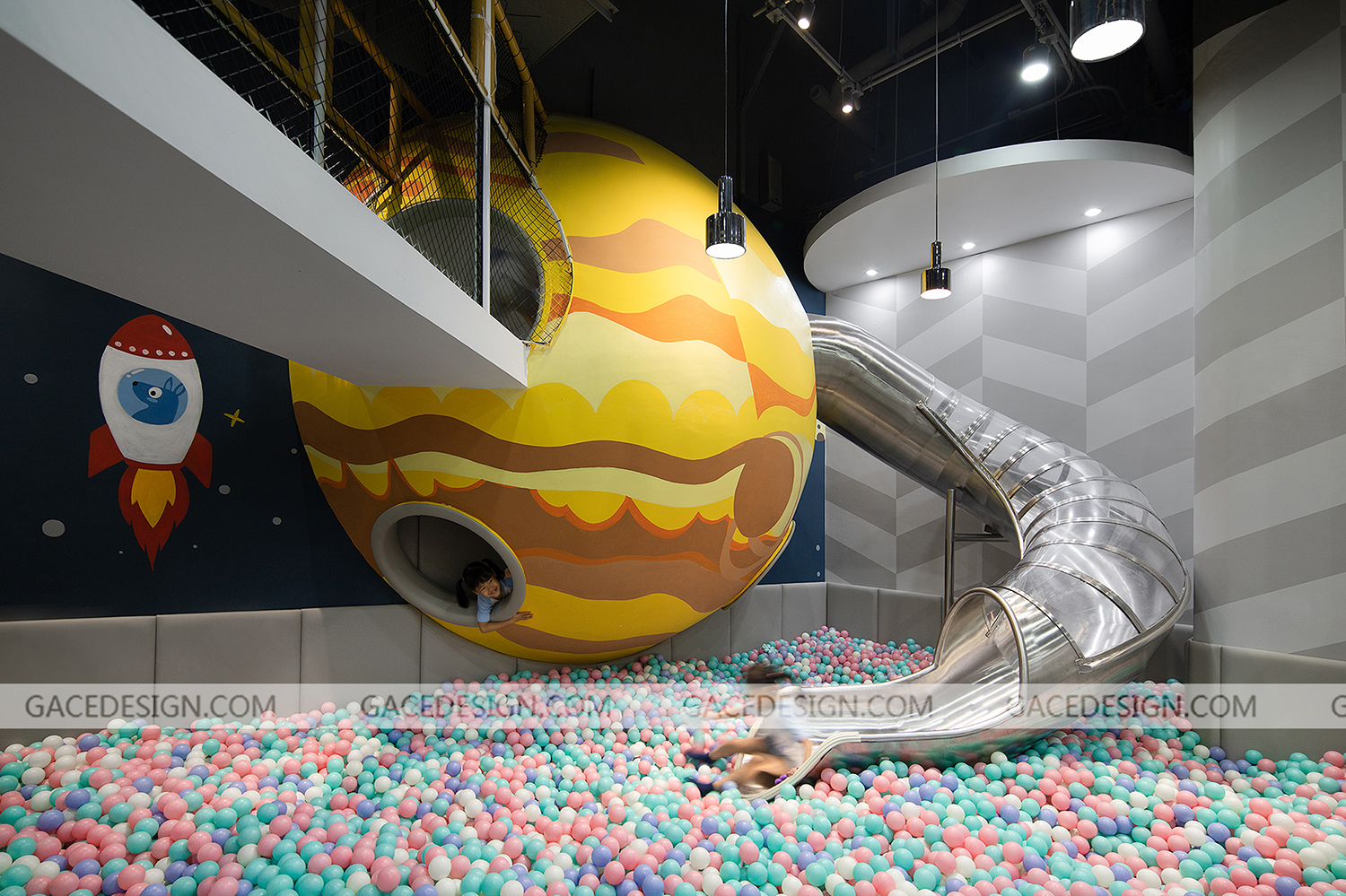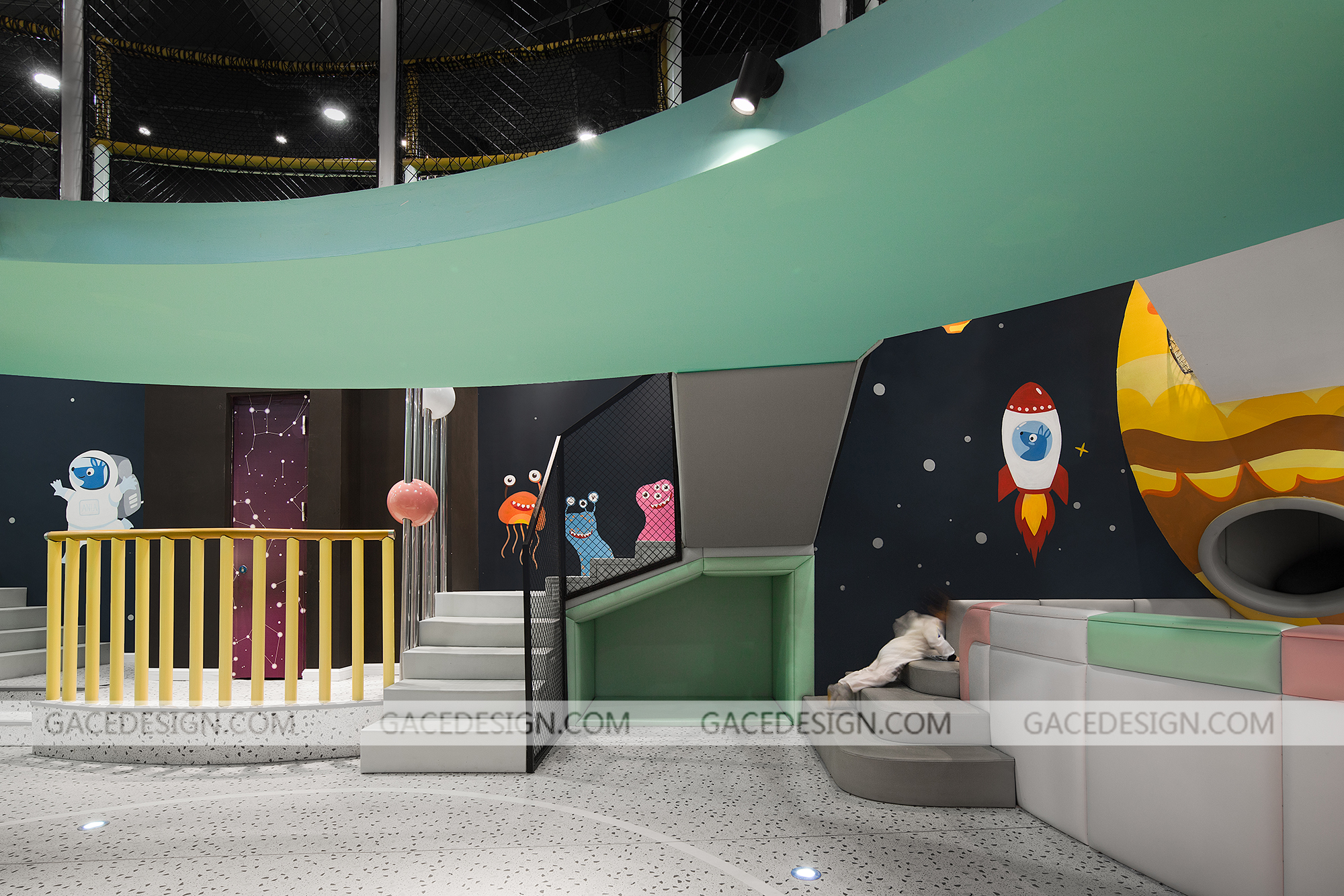 設計師將游樂場主題定為“未來星球”,以“未來”作為設計方向,以“星球”做為設計的核心。各種體量的“星球”在太空中穿行,打造出豐富多彩的星球世界。設計師根據孩子的冒險精神設定多種游戲玩法和路線,孩子進入游樂場后,首先需要了解故事背景,在置身其中不斷迎接挑戰,最終完成“拯救家園”的任務。整個游樂場分為前端接待區、中端靜態游戲區、后端動態游戲區。