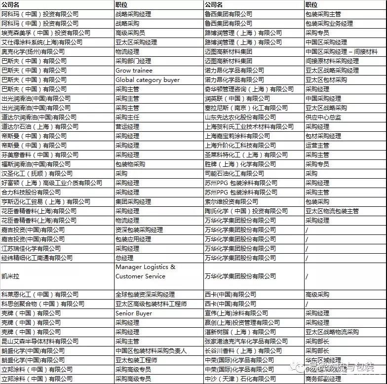阿科瑪;阿克蘇諾貝爾;??松梨?艾道瑪;艾津農(nóng)化;艾森半導體;艾仕得涂料;翱藍特;巴斯夫;拜森化工;碧辟;波士膠;常熟市匯邦新材料;出光潤滑油;傳化;道達爾;道康寧;德謙化學;帝斯曼;東勝;杜邦農(nóng)化;芬美意;福斯;德美;漢高;漢姆德華;漢圣;好富頓;好收成;亨斯邁;花臣;嘉寶莉;嘉實多;嘉榮;江山農(nóng)化;江蘇司能;江蘇揚農(nóng);金力泰;金陵力聯(lián)思;金山聯(lián)貿(mào);康普頓;科萊恩;科思創(chuàng);殼牌;可蘭素;昆山石梅;朗盛;立邦;利安隆;鈴鹿;龍蟠;路博潤;邁克斯;邁圖;南寶樹脂;南京紅寶麗;寧波漢圣;紐佩斯樹脂;歐諾法;龐貝捷;奇華頓;前程石化;瑞佳;潤英聯(lián);塞拉尼斯;沙多瑪;沙提;山東泰和;上海華誼;上海納克;上海昭和高分子;上緯;圣萊科特;勝牌;石家莊鑫隆威化工;蘇州金駝鈴;索爾維;泰和;陶氏;瓦克;萬華;先正達;宣偉;雪佛龍;亞什蘭;洋紫荊油墨;藝康;英威達;贏創(chuàng);優(yōu)雅化工;贊宇科技;湛新樹脂;張家港迪克;張家港協(xié)爾維;長春化工;長谷川;長興;浙江傳化華洋;浙江衛(wèi)星;鎮(zhèn)江聯(lián)成;中遠關(guān)西;中遠佐敦;重慶斯托賽克藍峰;莊信萬豐;紫荊花;佐敦