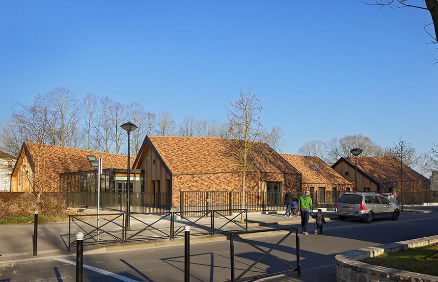 一座位于巴黎利耶于桑的幼兒園,設(shè)計師設(shè)計了大地色的陶瓷磚陶瓷磚的重疊像鵝卵石一樣覆蓋在獨特的坡屋頂建......