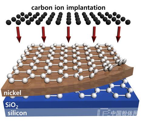 Kim的方法基于離子注入技術(shù)--一種和微電子器件相兼容的技術(shù),通常用來給半導(dǎo)體材料中摻入雜質(zhì)。在離子注入過程中,碳離子被電場加速,在500攝氏度的溫度下轟擊鍍有鎳層和氧化硅層的硅襯底。 鎳層,因其高的碳溶解度,被用來作為合成石墨烯的催化劑。隨后,整個(gè)樣品經(jīng)過高溫激活退火處理(約600到900攝氏度)使碳原子之間形成蜂窩狀晶格結(jié)構(gòu),也就是石墨烯的特征微觀結(jié)構(gòu)。