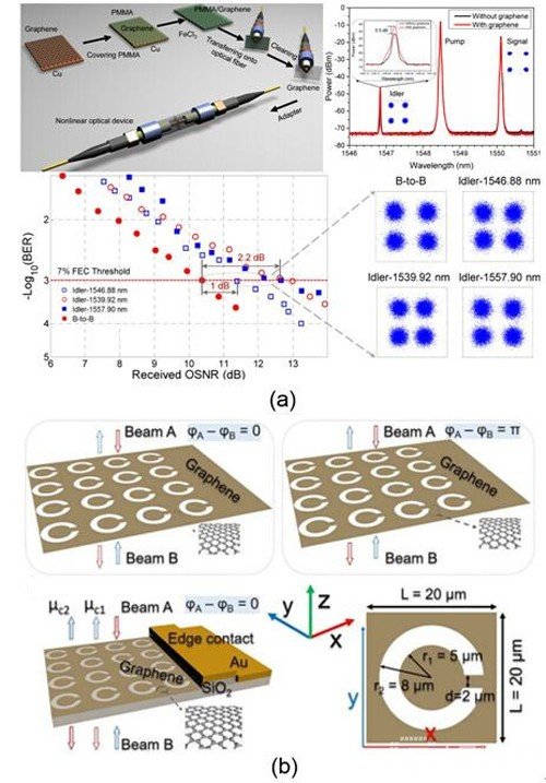 圖2 (a) 石墨烯制備工藝流程圖、石墨烯增強(qiáng)四波混頻效應(yīng)光譜圖、QPSK波長轉(zhuǎn)換BER曲線及星座圖; (b) 太赫茲波段基于石墨烯開口諧振圓環(huán)可調(diào)節(jié)CPA工作原理。