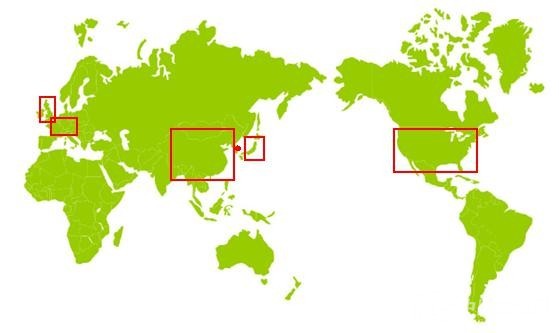 圖1 標(biāo)紅部分為石墨烯研究主要分布的國(guó)家及地區(qū)