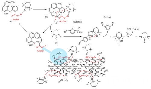 中國科學(xué)院山西煤炭化學(xué)研究所山西省生物煉制工程技術(shù)研究中心研究員侯相林帶領(lǐng)的研究團(tuán)隊,提出使用非金屬功能化石墨烯材料作為HMF選擇性氧化的催化劑。利用氧化石墨烯邊緣未成對電子與羧基協(xié)同作用,同時以2,2,6,6-四甲基吡啶氮氧化物(TEMPO)作為共催化劑,以氧氣為氧化劑,在相對溫和的條件下,實現(xiàn)了HMF的高轉(zhuǎn)化 (100%)和DFF的高選擇性(99%) (ACS Catal., 2015, 5, 5636-5646)。