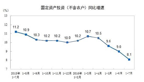 中國粉體網(wǎng)訊 據(jù)國家統(tǒng)計局最新統(tǒng)計顯示,2016年1~7月份,中國固定資產(chǎn)投資(不含農(nóng)戶)311694億元,同比名義增長8.1%,增速比1-6月份回落0.9個百分點。從環(huán)比速度看,7月份固定資產(chǎn)投資(不含農(nóng)戶)增長0.31%。