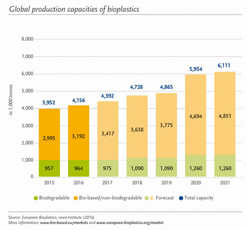 中國粉體網(wǎng)訊 根據(jù)歐洲生物塑料協(xié)會(huì)的數(shù)據(jù)顯示,到2021年,全球生物塑料行業(yè)的生產(chǎn)能力將從420萬公噸將增加到610萬公噸。