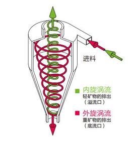 它所使用的主要設(shè)備是水力旋流器,水力旋流器的工作原理是,給定礦漿合適的壓力下切向給料,膨潤土顆粒根據(jù)粒度密度差異在旋流器內(nèi)形成一個回旋流,旋流中心具有較大的離心力。膨潤土礦漿往中心軸行動中形成了一個較低壓帶,這樣可按粒度密度大小分級。