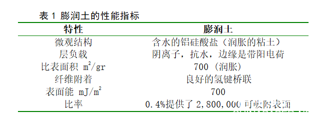 膨潤土的特性有助于吸收和吸附廢水中和回用白水中的溶解性膠體物質,如表1。從某種角度說,作為一種微觀的海綿,加上其極易留著在紙頁中的特性,使得膨潤土在清除過程水中的可溶性垃圾中起了重大作用。