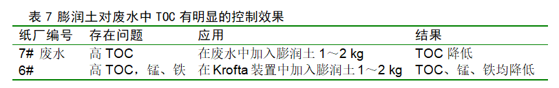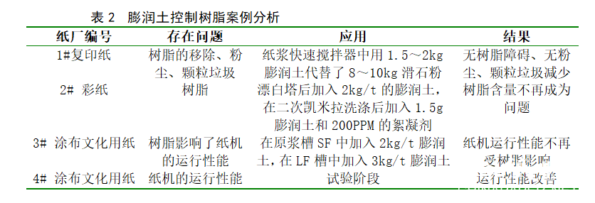 表2提供了幾個采用膨潤土及部分其他化學品的案例來移除樹脂、并最后去除了樹脂障礙、避免絮聚、降低膠粘性。