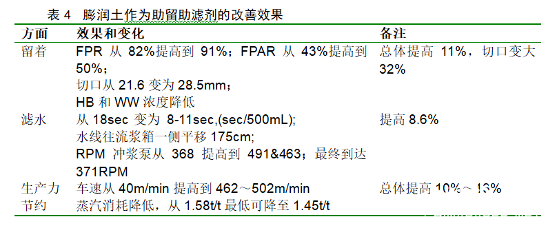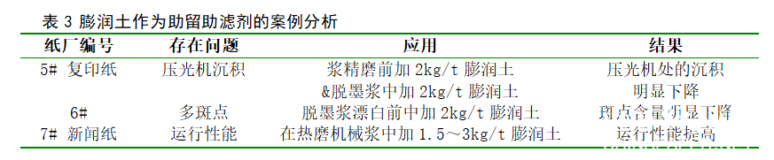 相比于十年前,現(xiàn)代造紙工業(yè)更加注重節(jié)約用水。部分制漿造紙過程采用封閉水循環(huán),即造紙廢水的“零”排放理念。但“零”排放理念帶來的問題是,當新鮮水補給減少時,陰離子垃圾和無機廢料達到飽和。從而造成了TOC含量和電導率的升高,這兩者的升高又進一步導致了紙機運行性能的變差。事實證明,能有效解決這一問題的微小顆粒是膨潤土。表3為膨潤土提高紙機運行性能的幾個案例。
